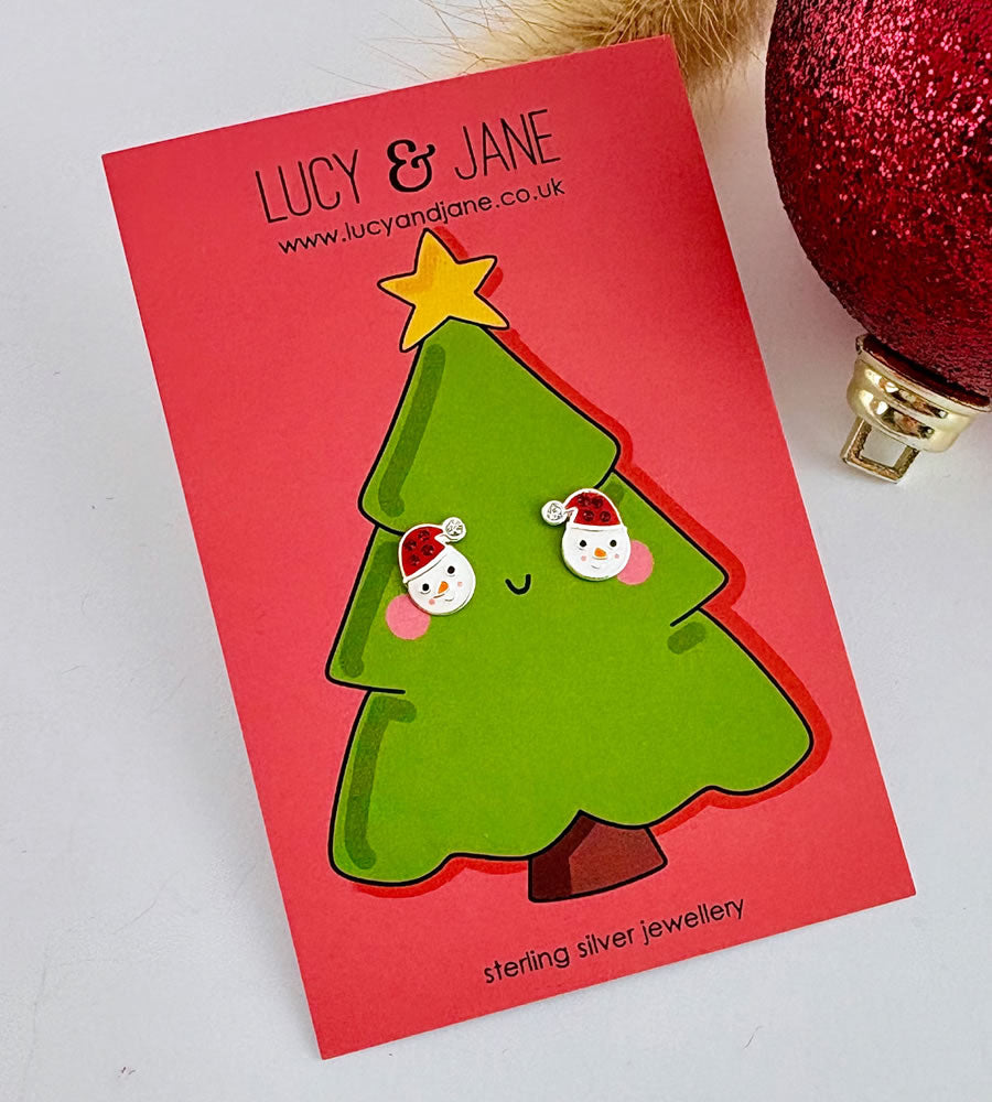 Sterling silver snowmen earrings with sparkly red santa hats to get you in the Christmas spirit.