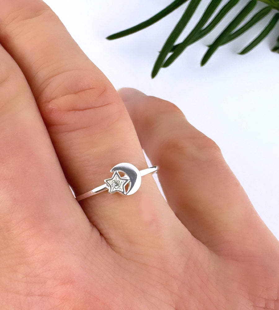 Love moon and stars? You'll love this beautiful sterling silver band featuring a small moon and star. The star has a tiny crystal at the centre for a subtle sparkle.