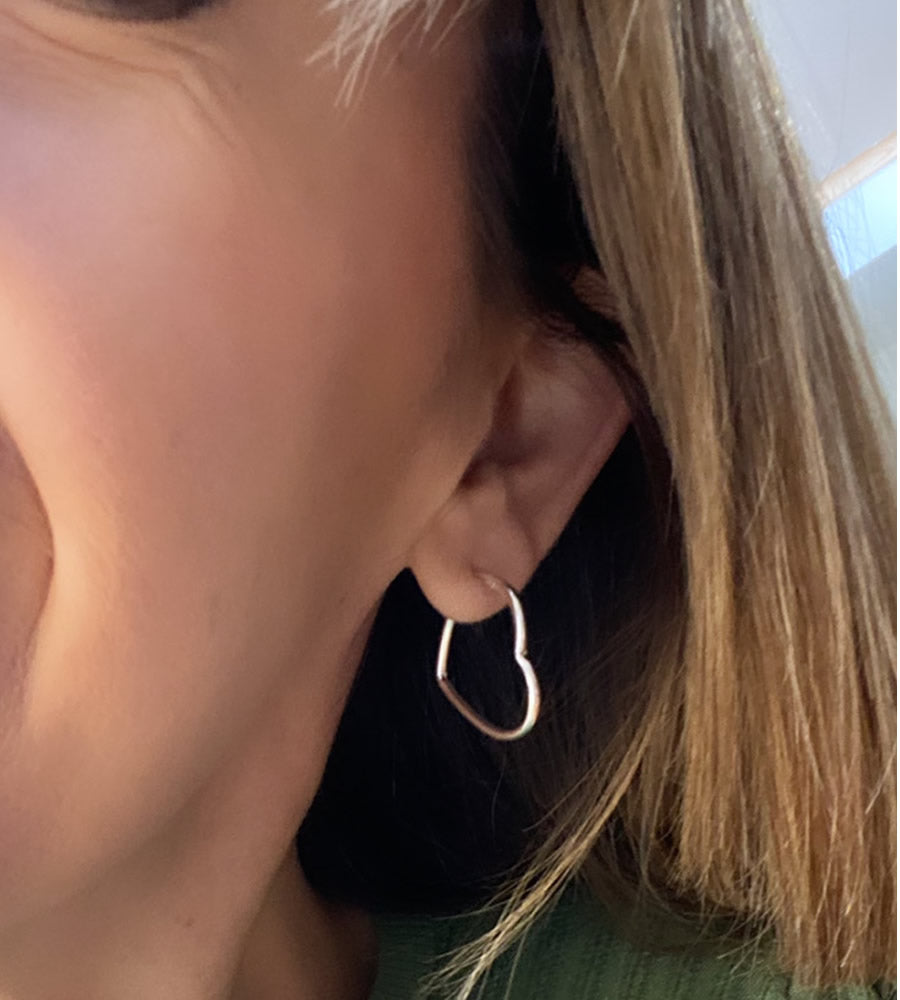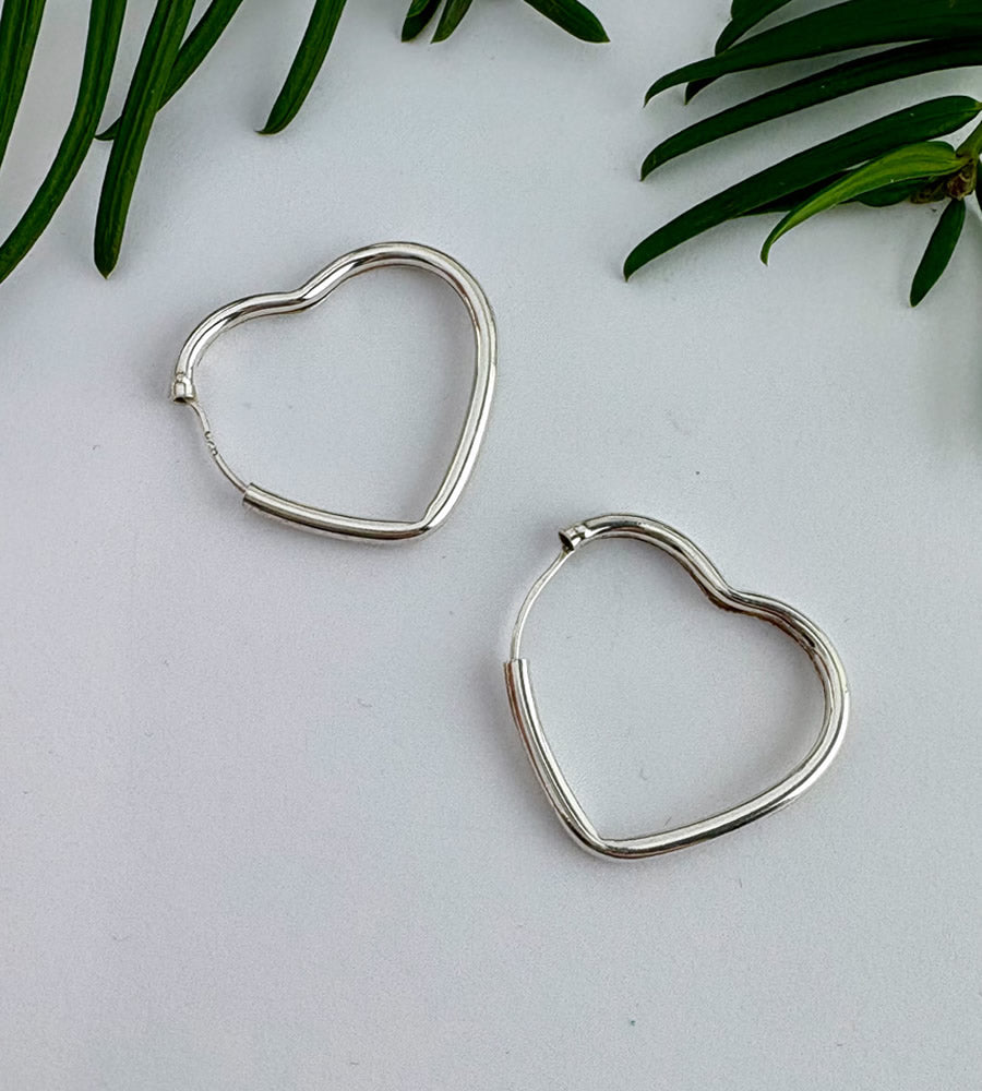 Sterling silver heart shaped medium sized hoops. Easy sleeper style to wear, Just pull the thiner post out, pop through your piercing and then slide back in the other side.