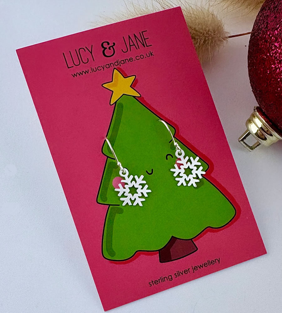 dangly sterling silver Snowflake earrings on a red 'Lucy & Jane' card with Christmas text