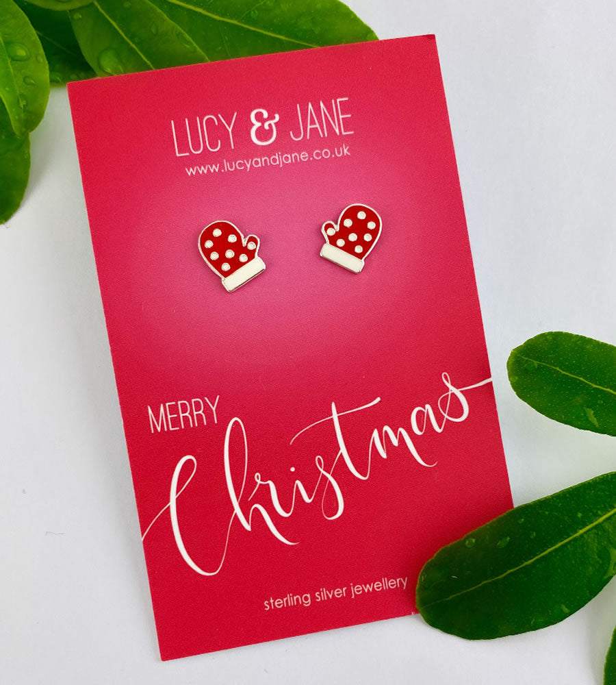Looking for a fun pair of winter studs? Love these cosy sterling red mitten studs with white polka dots!